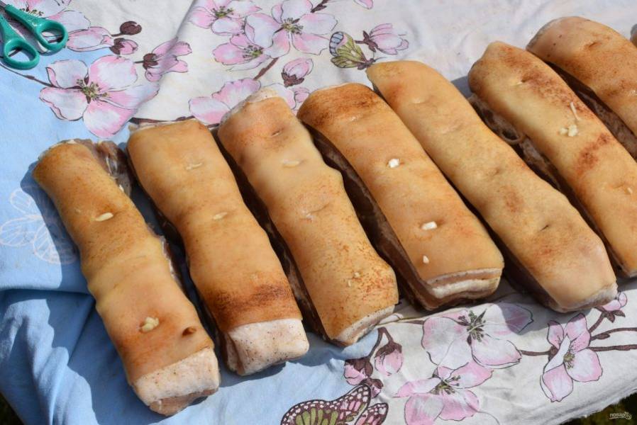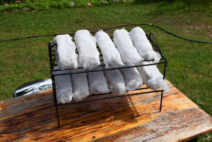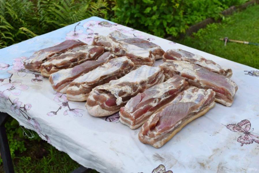 Разложите мясо, чтобы оно высохло. На это уйдет 4-5 часов. Хорошо, если есть возможность мясо подвесить. Так процесс вяления пройдет быстрее.