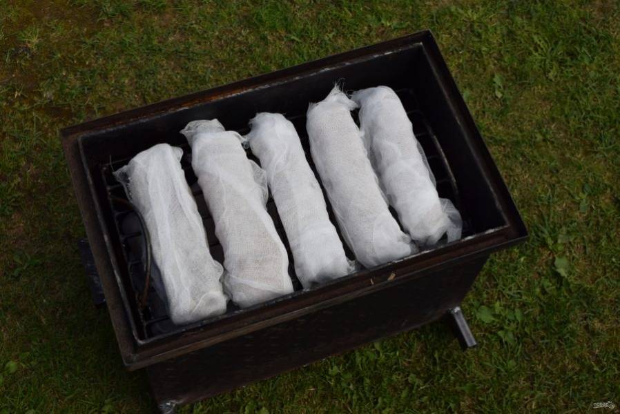Для копчения каждый кусок мяса оберните в 3-4 слоя марли. При копчении лишняя гарь осядет на марле, а аромат все равно пропитается до мяса. Выложите мясо на решетку коптильни, оставляя небольшие промежутки между кусочками.