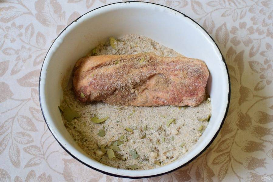Каждый кусочек грудинки обильно обваляйте в соленых специях.