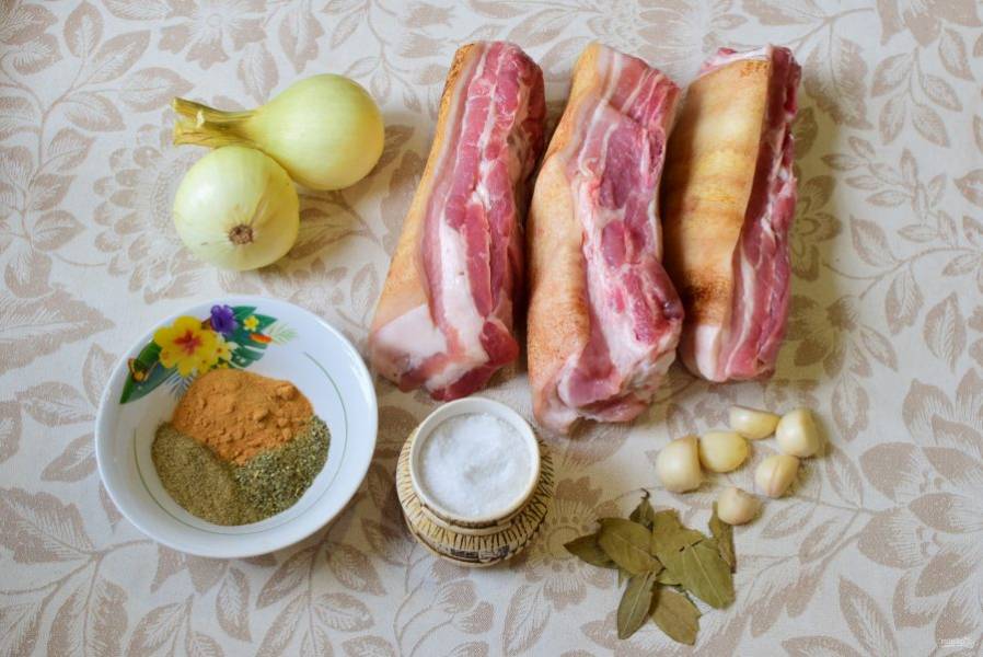 Для приготовления подготовьте необходимые ингредиенты. Грудинку нарежьте на кусочки, удобные для копчения, по размеру коптильни. Очистите лук и чеснок. Специи берите на свой вкус. Оптимально взять молотый перец, паприку и сушеные травы, например, базилик.