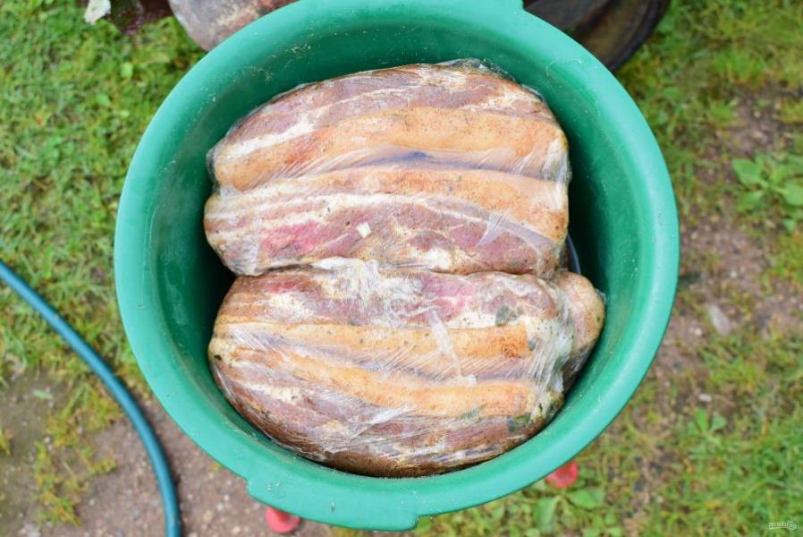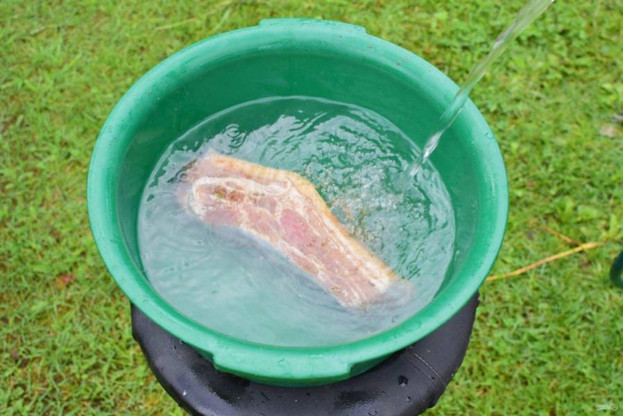 Теперь грудинку разверните и промойте от лишней соли и специи.
