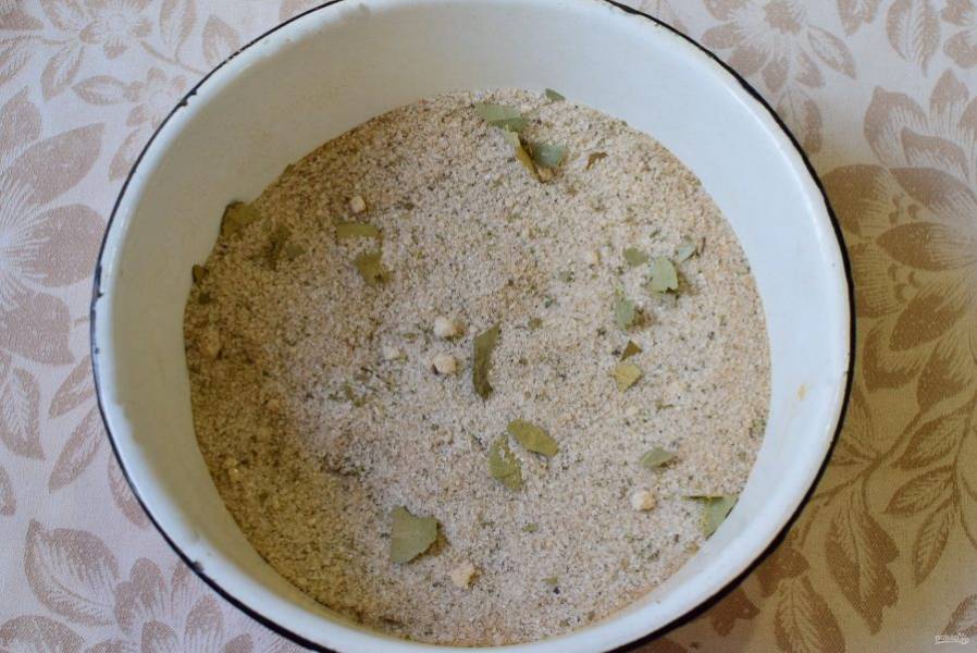 Смешайте соль и специи. Добавьте поломанный лавровый лист.