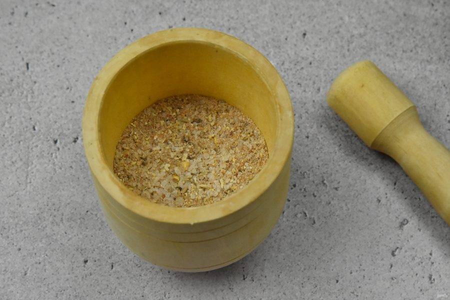 Специи, сахар и соль поместите в ступку и разотрите в порошок. Разделите получившуюся смесь на две части.