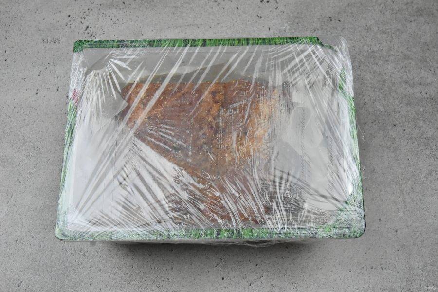 Оберните контейнер с мясом пищевой пленкой, для избежания попадания воздуха, и поместите в холодильник на 9 дней.