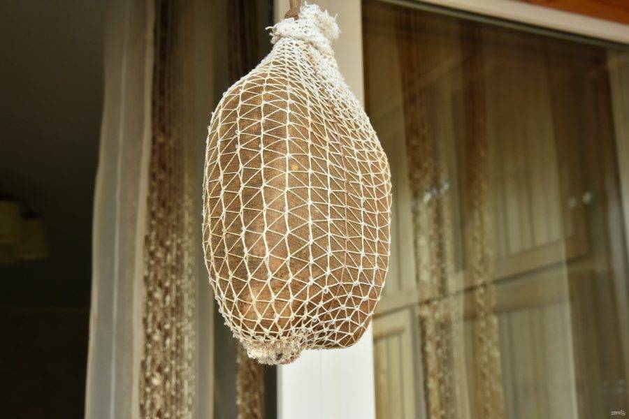 Поместите мясо на 6-12 часов в проветриваемое помещение с температурой 21-26 градусов. Переместите мясо в прохладное место (погреб, подвал). В моем случае это холодильник. Вяльте мясо до потери им 30% объема. Во время вяления переворачивайте подвешенное мясо. Примерно на этот процесс уйдет 1,5 месяца.