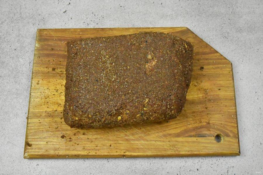 Через 9 дней достаньте мясо из холодильника и натрите его оставшейся половиной специй.