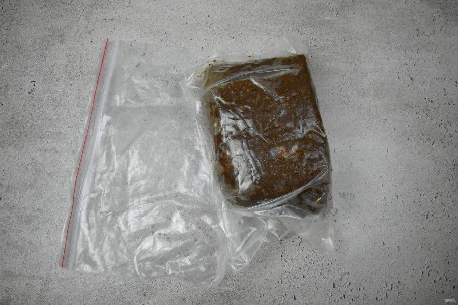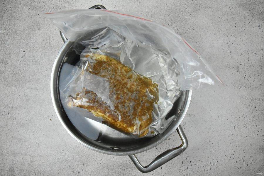 Для маринования мяса можно воспользоваться вакуум-пакетами. Если у вас нет вакууматора, можно обойтись без него. Для этого выложите кусок мяса в зип-пакет и закройте зиплок оставив пакет приоткрытым на пару сантиметров. Наполните кастрюлю водой. Аккуратно опустите пакет в воду, которая вытеснит из него воздух. Закройте полностью замок и достаньте пакет из кастрюли с водой.