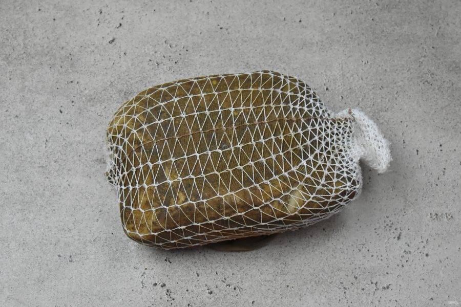 На данном этапе можно натереть мясо смесью специй без добавления соли. Поместите мясо в оболочку. Это может быть коллагеновая пленка или вощеная бумага. Я воспользовалась лайфхаком с сайта изготовителей домашних колбас. Поместила кусок мяса в новый капроновый носок и формовочную сетку. Закрепила концы с обеих сторон.