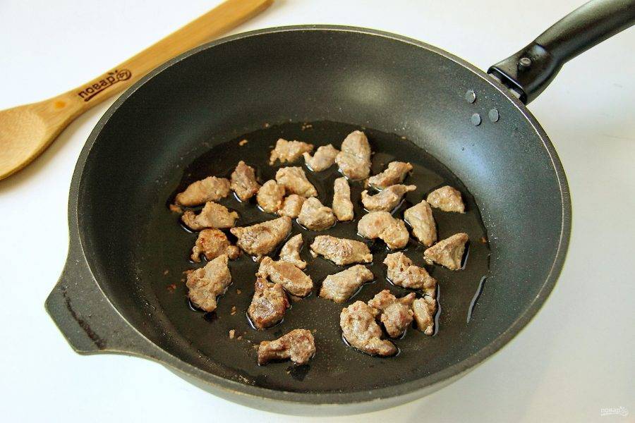 Мясо нарежьте небольшими кусочками и обжарьте на небольшом огне до готовности, добавив 2 ст. ложки масла.