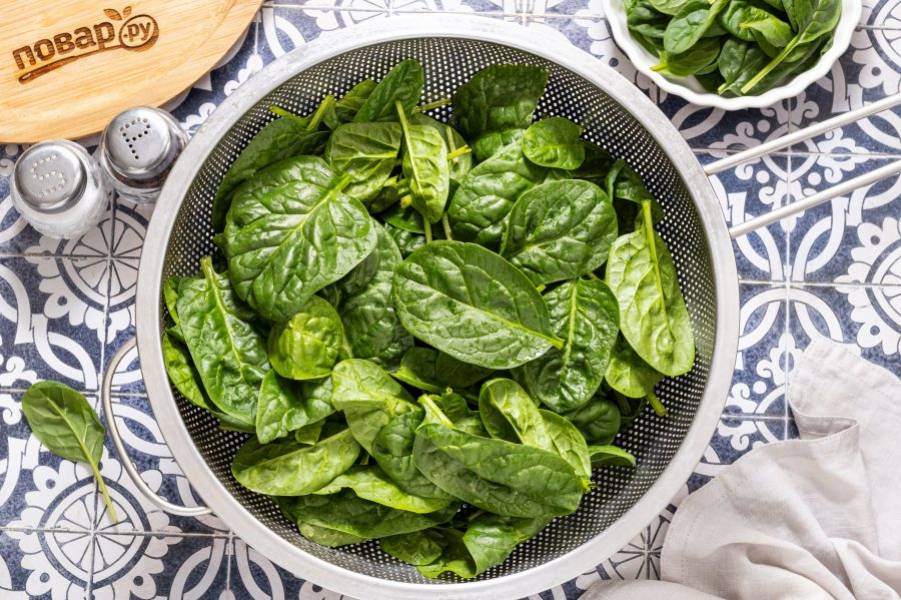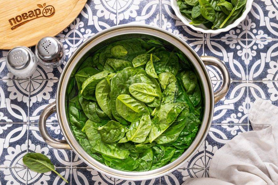 Вскипятите воду. Добавьте шепотку соли. Опустите в кипящую воду шпинат и оставьте на 20-30 секунд.