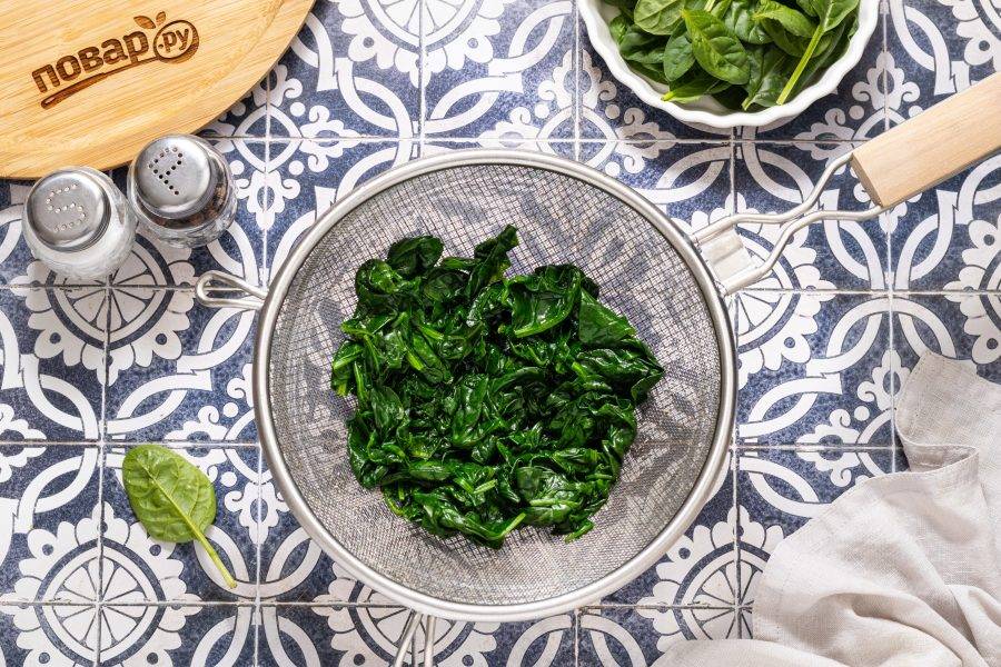 Хорошо отожмите шпинат, можно его крупно порезать. Переложите в миску.