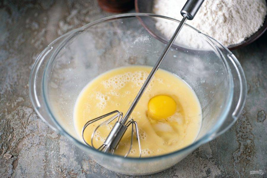 В просторную миску залейте теплое молоко, добавьте сахар и растопленное сливочное масло. Перемешайте все венчиком.