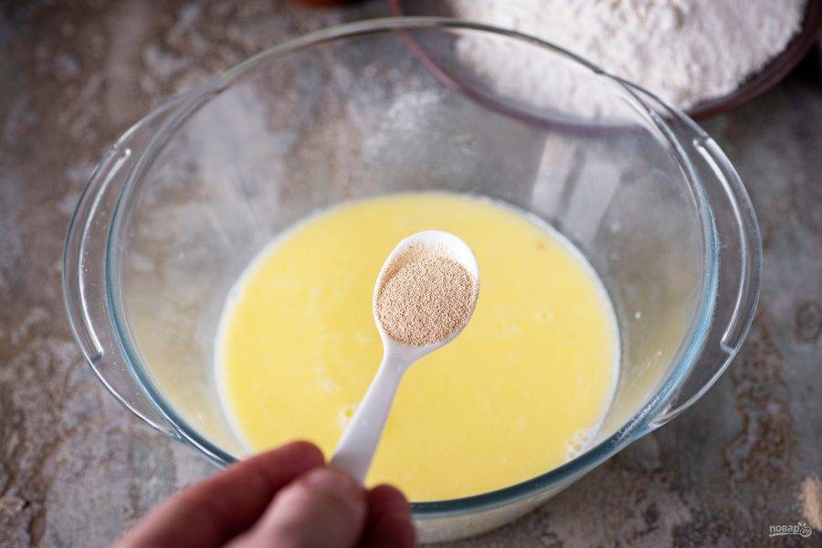 Добавьте к этой смеси сухие дрожжи и все перемешайте.