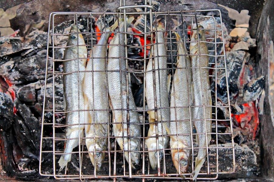 Выложите подготовленную корюшку на решетку для мангала. Подготовьте угли и установите решетку на мангал.