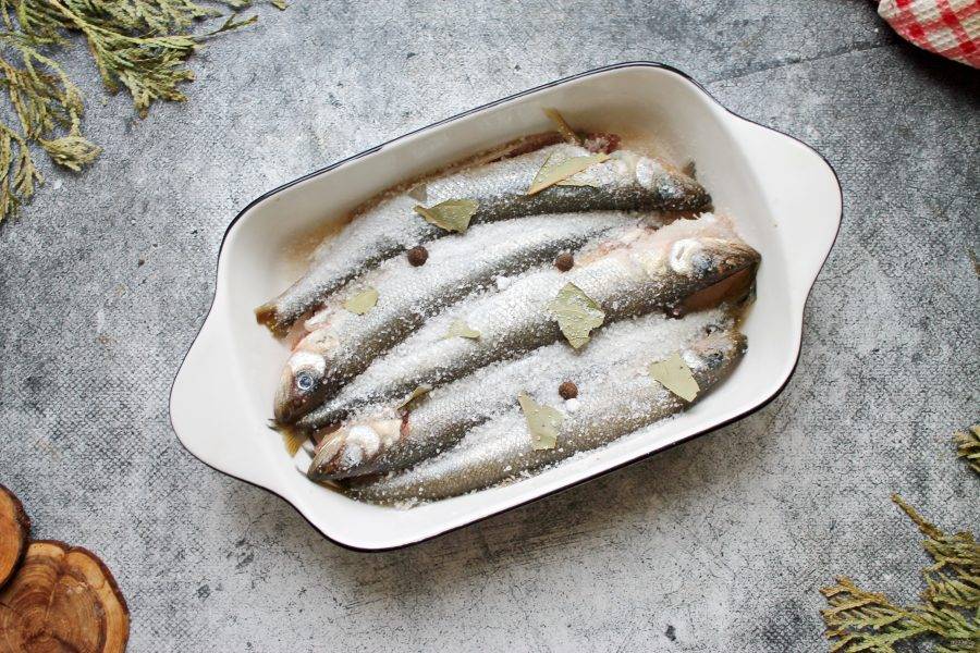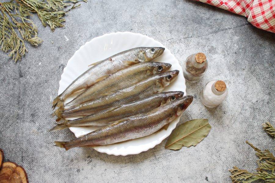 Подготовьте все необходимые ингредиенты для приготовления корюшки сухого посола.