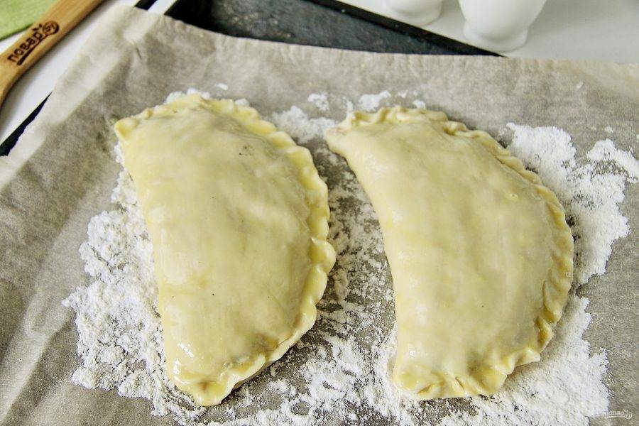 Противень застелите бумагой для выпечки, присыпьте ее мукой и выложите пироги. Смажьте поверхность взбитым желтком и отправьте в разогретую до 180 градусов духовку на 50-60 минут.