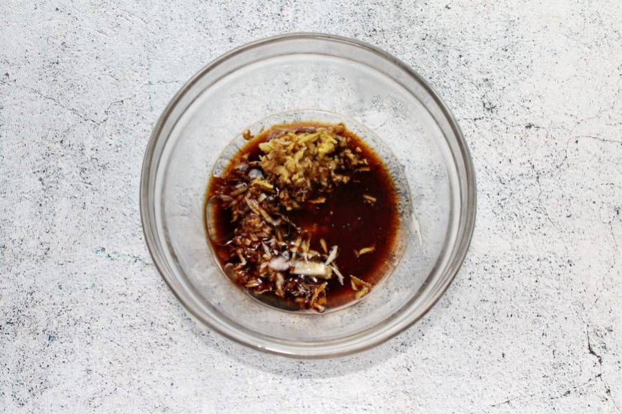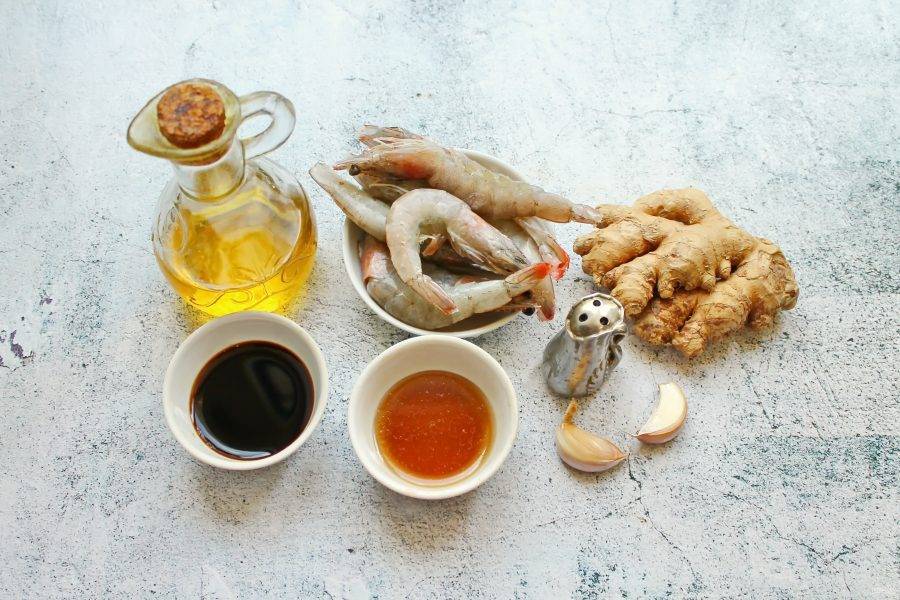В миску налейте соевый соус, растительное масло, мед, добавьте тертый имбирь и чеснок. Все перемешайте, залейте королевские креветки, перемешайте и оставьте мариноваться на 30-60 минут.