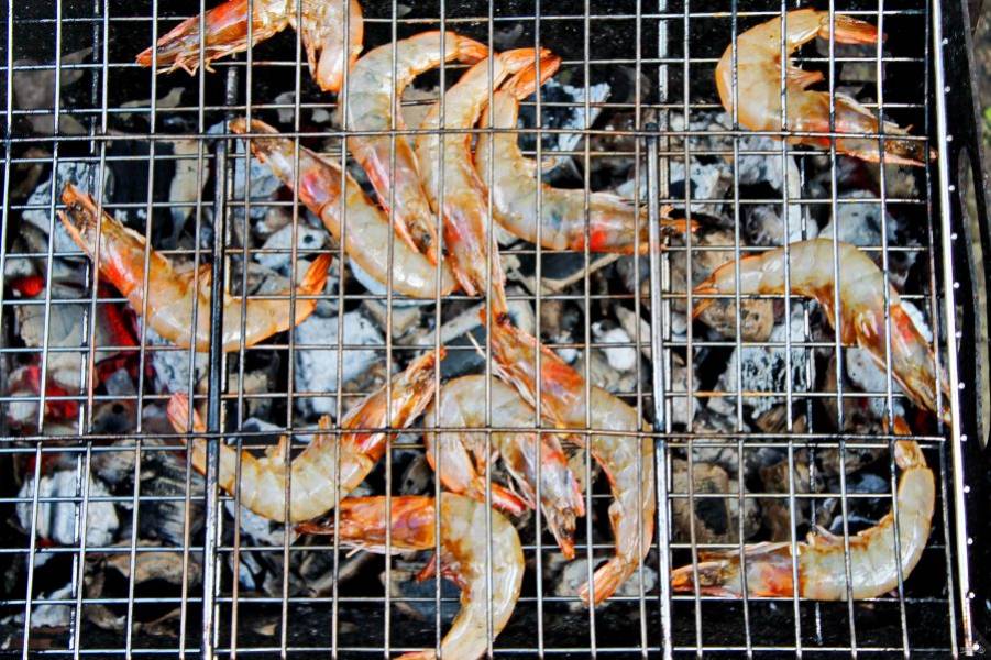 В мангале разожгите угли и дайте им прогореть до седых углей. Креветки разложите на решетке для мангала.