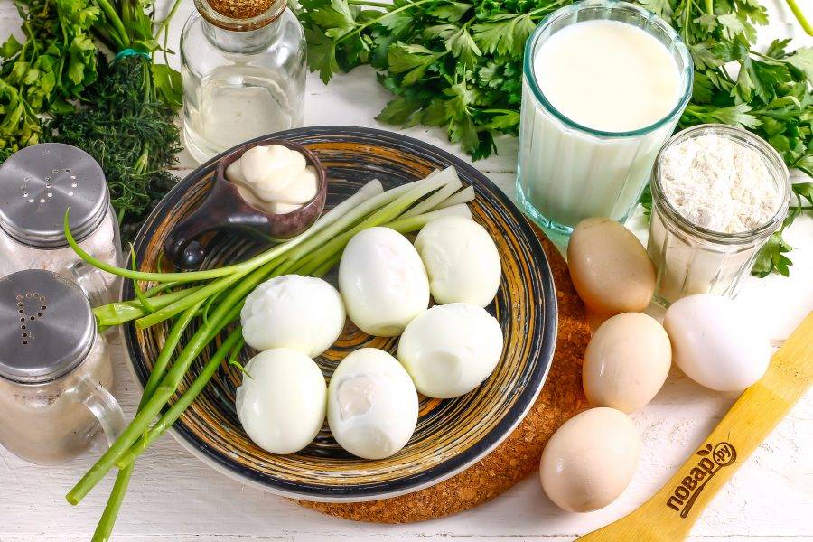 Подготовьте указанные ингредиенты. Для начинки заранее отварите куриные яйца, остудите их и очистите, не используя те, которые предназначены для блинного теста.