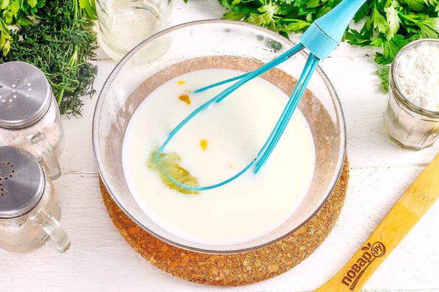 Взбейте молоко с куриными яйцами и солью в глубокой емкости.