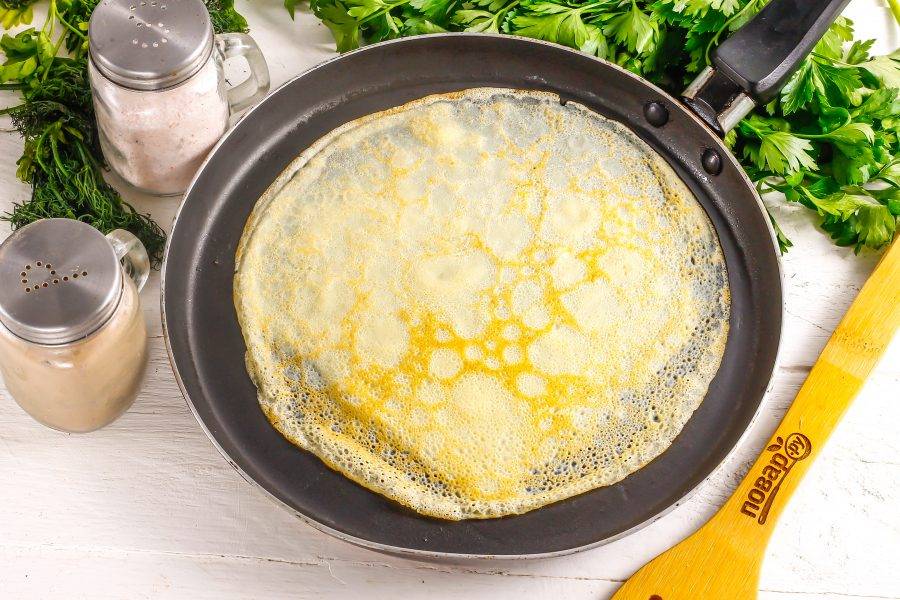 Прогрейте сковороду на плите, включая средний нагрев. Смажьте ее в первый раз растительным маслом и влейте порцию теста. Испеките блин по 1 минуте с каждой стороны. Таким образом приготовьте и остальные блины.