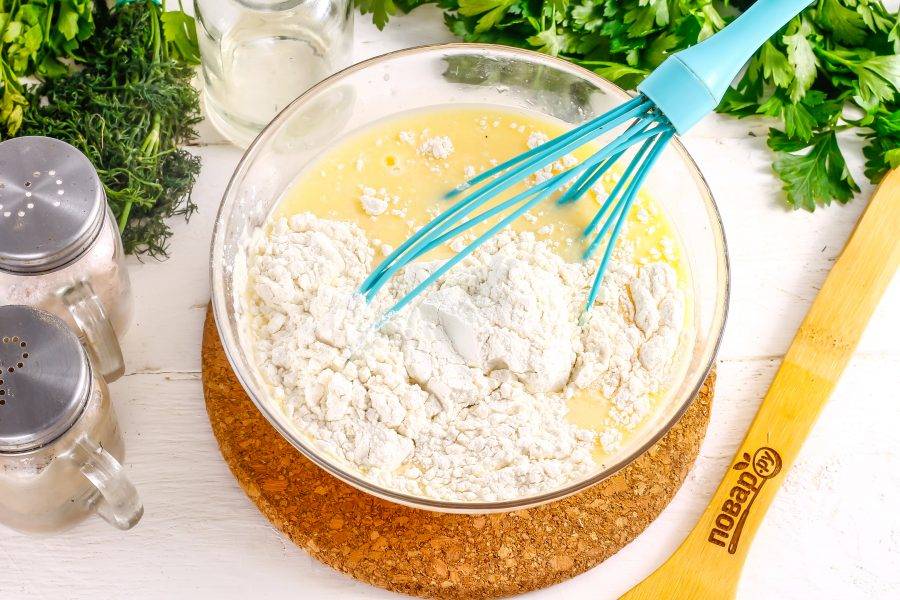 Всыпьте пшеничную муку, взбейте еще раз. Влейте растительное масло и перемешайте. Оставьте на 20 минут тесто в покое, чтобы активировалась клейковина.