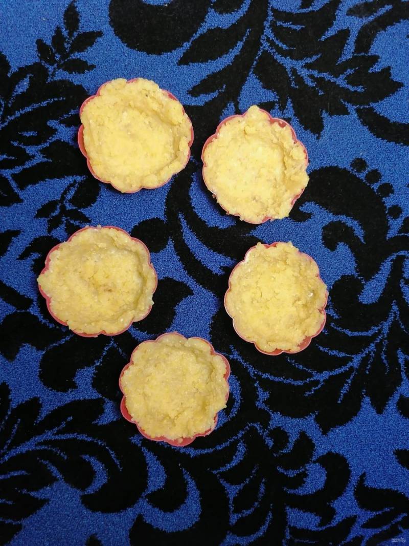 Готовую поленту выкладываем в формочки и распределяем ее по формочкам руками, смоченными в холодной воде, делая бортики по краям. Я выпекала в силиконовых формочках в виде розочек.