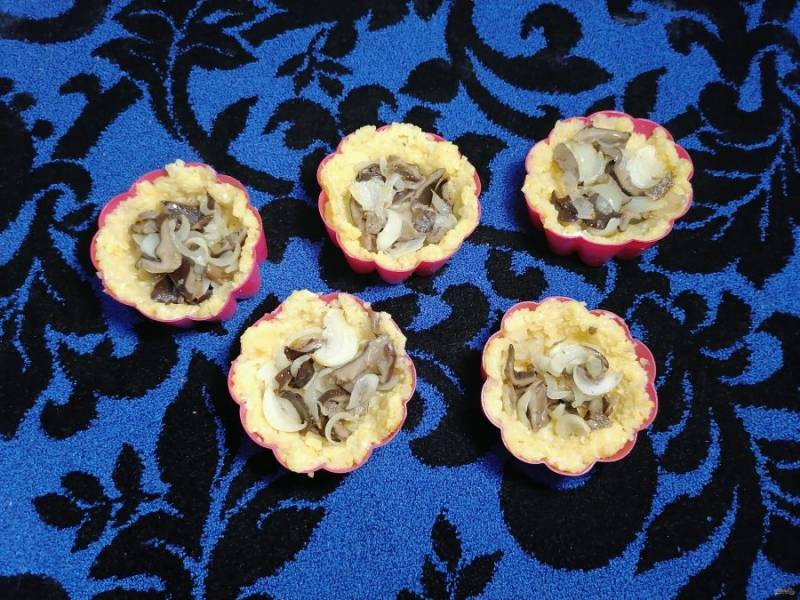 В каждую формочку на поленту кладем 1 чайную ложку майонеза. Затем распределяем по всем формочкам грибы с луком.
