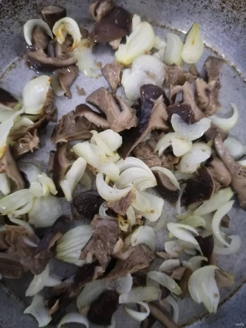 Чистим репчатый лук, режим его и обжариваем на растительном масле, добавляем мелко порезанные соленные грибы (у меня взяты подорожки). И все обжариваем до готовности.