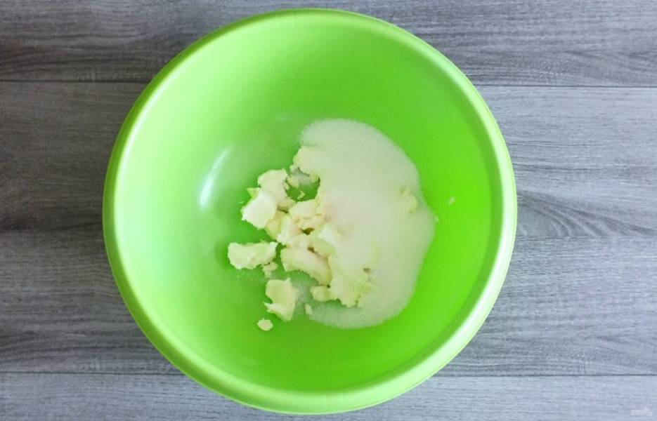 Соедините в чаше мягкое сливочное масло с сахаром. Разотрите с помощью вилки.