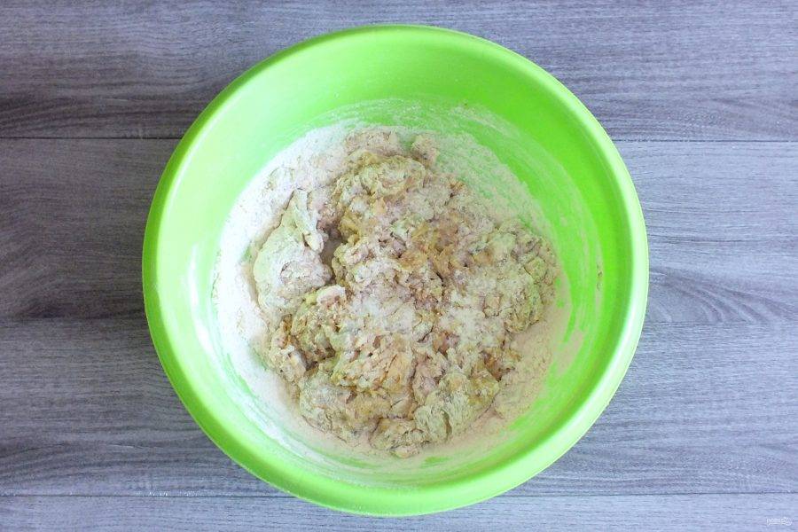 Как только тесто начнет собираться в комочки, месите руками. Если необходимо добавьте еще 20-30 грамм муки.
