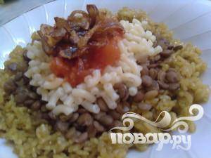 Выкладываем на блюдо слой риса, затем слой чечевицы, отварные макароны, томатный соус и лук.