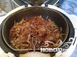 Поджарить лук в большом количестве масла до золотистого цвета.