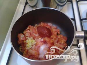Томатный соус: В кастрюлю положить нарезанные помидоры, тертый чеснок, 1/2 ч.л. соли. Добавить 1/2 чашки воды и перемешать. Кипятить на медленном огне в течении 20-30 минут. Добавить немного воды если необходимо.