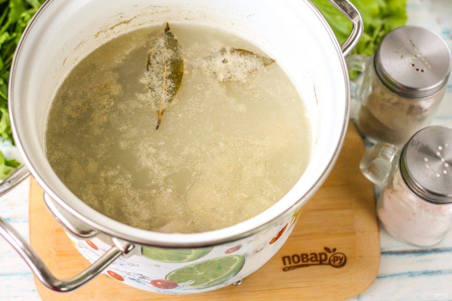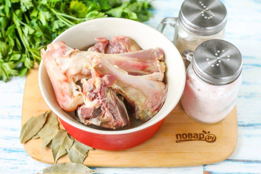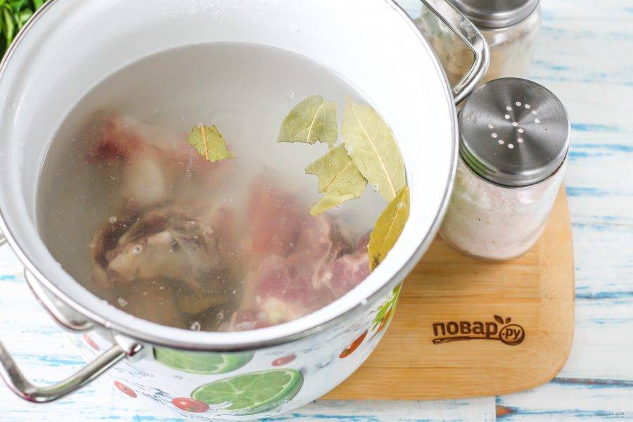 Приобретите мясные кости или же срежьте с них мякоть для приготовления другого блюда, а кости пустите на бульон. Промойте их в воде и выложите в кастрюлю или казан. Добавьте туда же соль и лавровые листья.