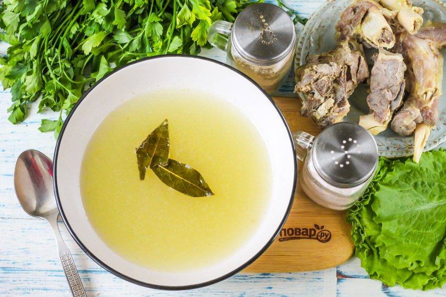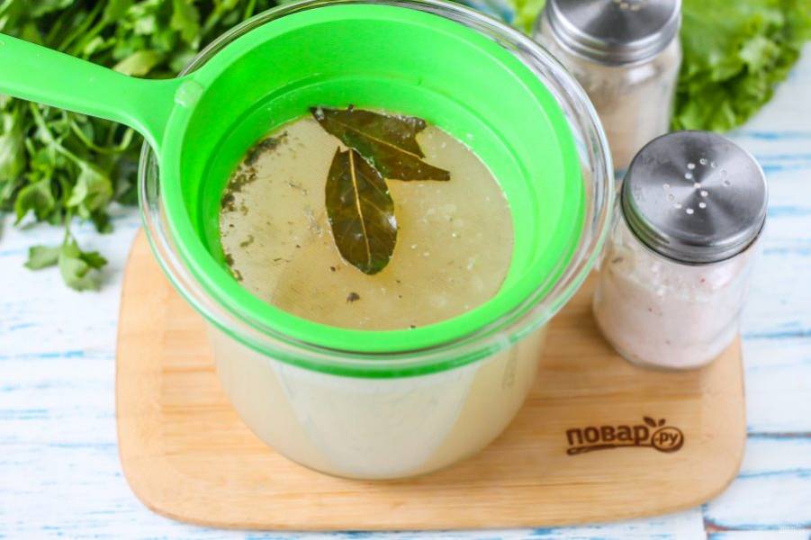Выключите нагрев и дайте бульону слегка остыть, буквально 5 минут.