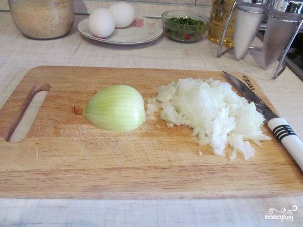 Пока грибочки варятся, мы чистим репчатый лук и нарезаем его как можно мельче.