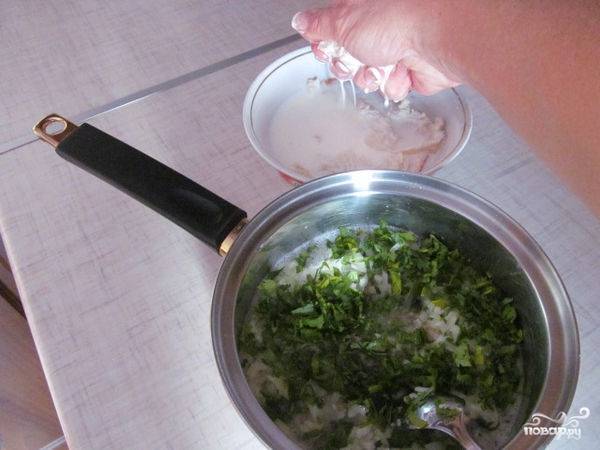 Теперь соединяем все ингредиенты: перекладываем в миску с яйцами грибной фарш, отжатый батон, мелко нарезанный лук и зелень. Тщательно все перемешиваем.
