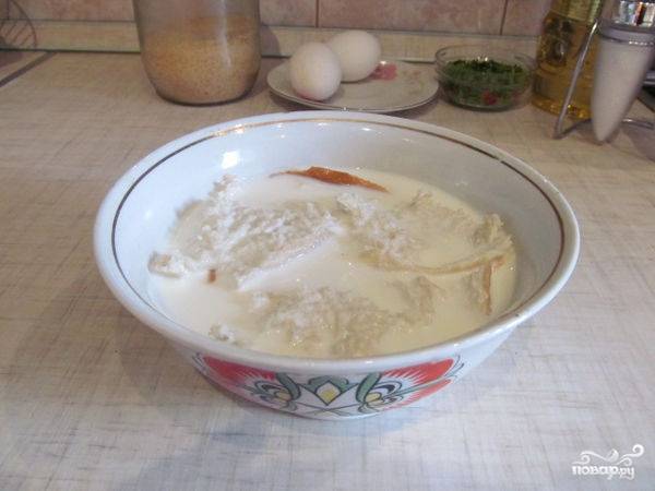 Батон (лучше всего вчерашний) выложить в миску и залить молоком, оставить на 10 минут.