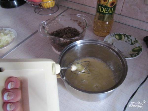 В отдельную посуду разбиваем 2 яйца, добавляем соль и хорошенько взбиваем до образования пены.