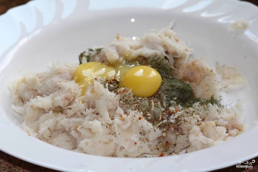 4. Получившийся фарш выкладываем в тарелку. Вбиваем 2 яйца, солим и перчим. Можно также добавить какие-либо специи на собственное усмотрение, например, приправу для рыбы, карри и т.д. Тщательно перемешиваем все ингредиенты до получения однородной массы.
