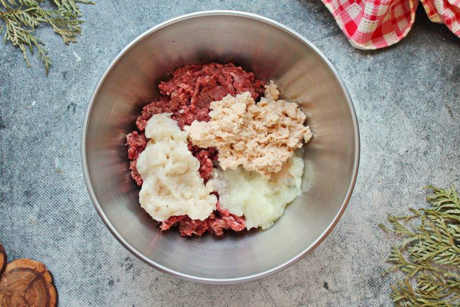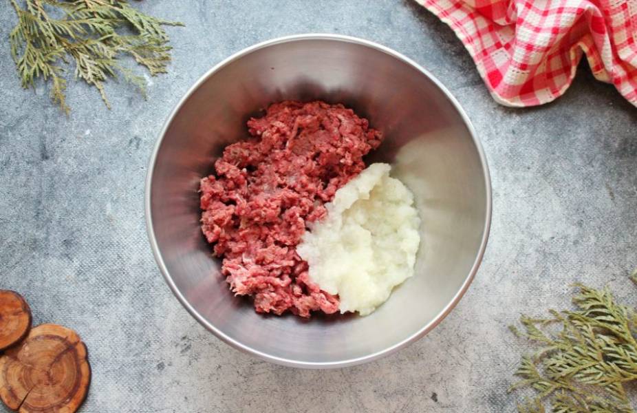 Репчатый лук и чеснок почистите и сполосните. Мясо, чеснок и репчатый лук порежьте на кусочки, пропустите через мясорубку с мелкой решеткой.