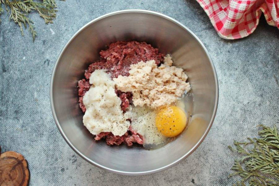 Сало порежьте и пропустите через мясорубку. Сало и замоченную булку добавьте в миску с фаршем и луком.