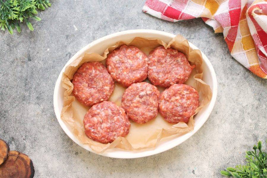 В форму для выпечки налейте немного воды и застелите пергаментом, смажьте растительным маслом. Разделите фарш на равные части, у меня их шесть, и влажными руками сформируйте круглые котлеты. Выложите котлеты из говядины в форму.