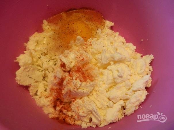 2. В творог добавляем яйцо, соль, черный молотый перец, паприку и травы по вкусу. Хорошо все перемешиваем. Можно перебить блендером.