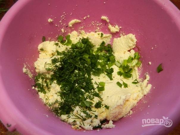3. Затем к творожной массе добавляем измельченную зелень: петрушку, зеленый лук, укроп.