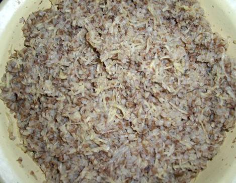 Когда гречка сварится, подождем, пока она остынет, а затем добавим к ней картофель. Вы можете не отжимать картофель от сока, тогда добавлять воду вам не придется, если же вы ее отожмете, то нужно влить предусмотренный в составе стакан воды. Итак, соединяем картофель с отварной гречкой, добавляем соль и перец по вкусу, перемешиваем все.