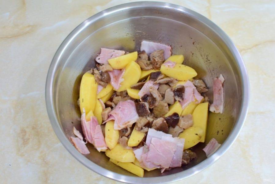 Сюда же добавьте грибы и нарезанный бекон. Все перемешайте и оставьте постоять.