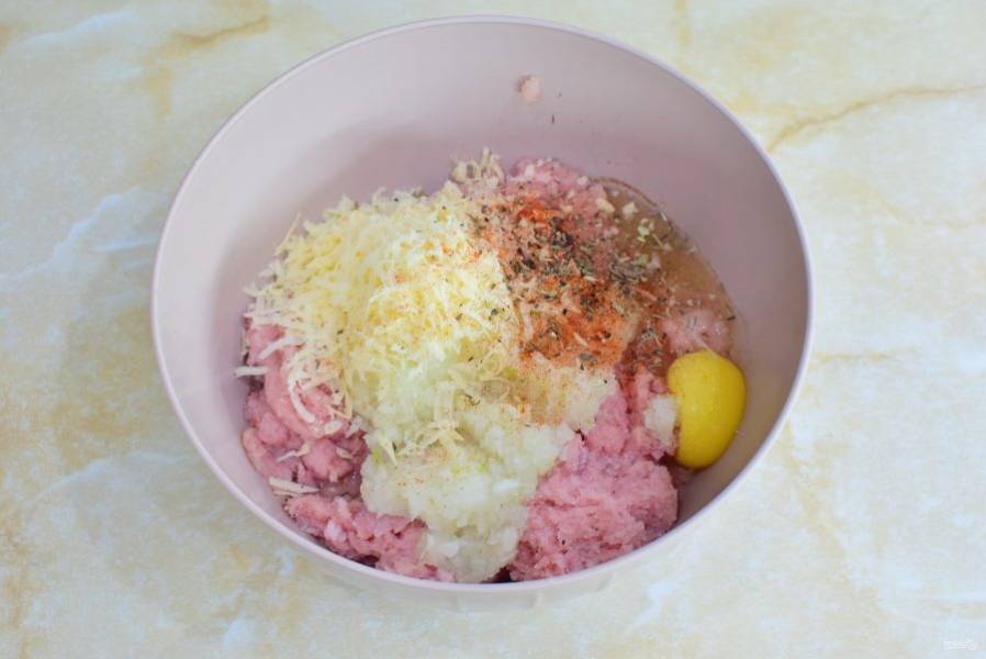 Смешайте фарш с измельченным луком и яйцом. Добавьте тертый сыр. По вкусу подсыпьте соль и специи.