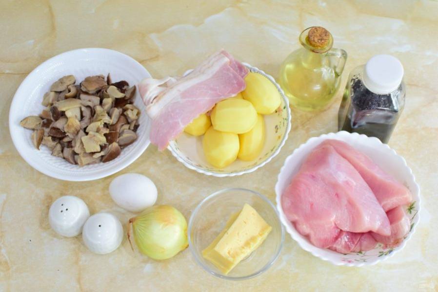 Для приготовления блюда подготовьте все необходимое. Если грибы заморожены, то дайте им время самостоятельно оттаять. Картофель очистите от кожуры и промойте от загрязнений.